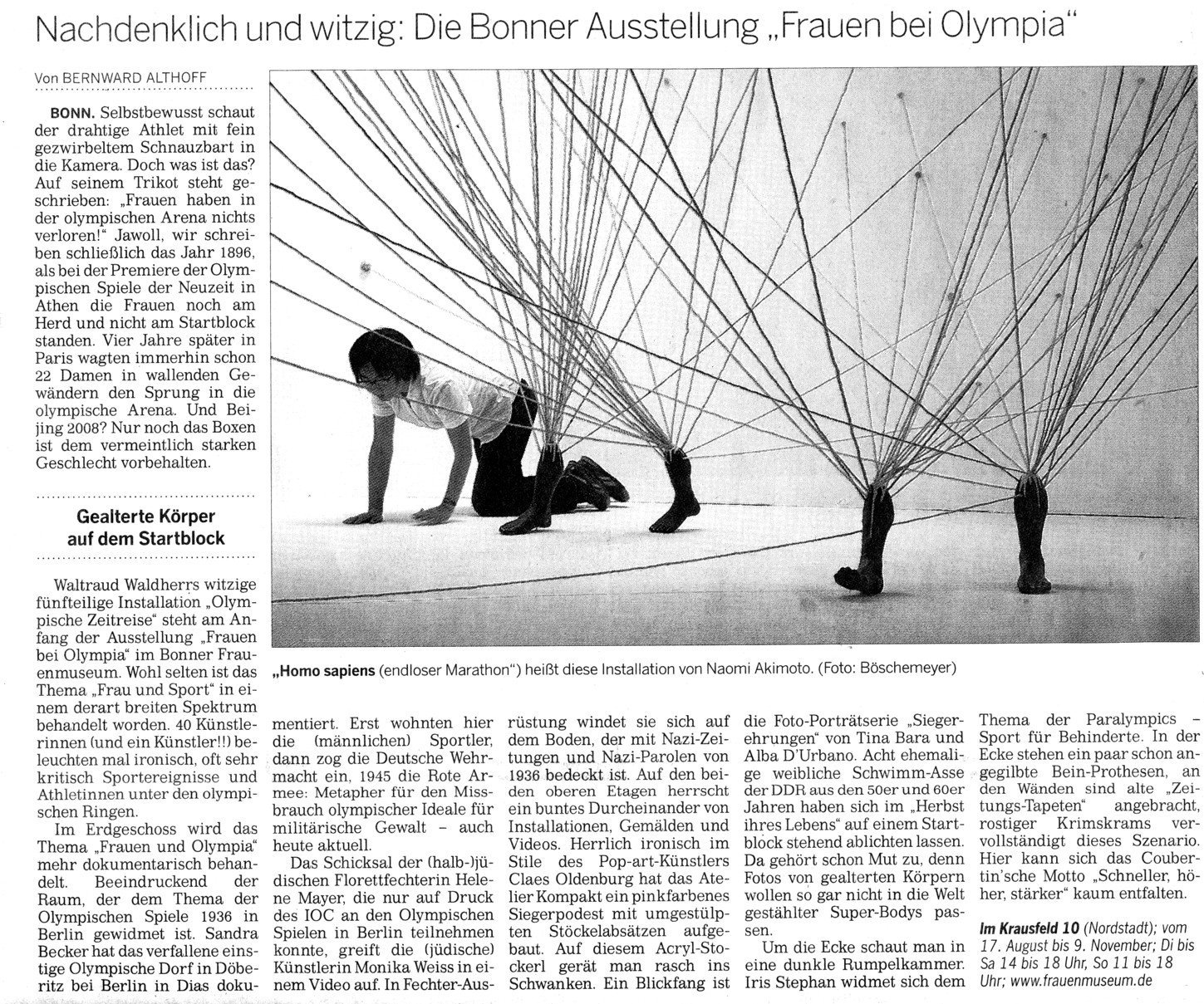 Ein interdisziplinäres Ausstellungsprojekt mit historischem Bereich; Installationen, Objekte, Video- und Fotoarbeiten von internationalen Künstlerinnen, Kuratorin Gudrun Angelis. Dieses Projekt stellt die Entwicklung und die Auseinandersetzung über die Beteiligung von Frauen an den Olympischen Spielen dar. Damit einhergehend werden gesellschaftspolitische Forderungen und Einstellungen der jeweiligen Zeit näher beleuchtet. In Form von wissenschaftlichen Beiträgen und mittels der Kunst wird die Rolle der Frau im Rahmen der Olympischen Spiele im geschichtlichen Rückblick und in der Gegenwart gezeigt. Einen besonderen Stellenwert nehmen dabei die genwärtigen Themen und Perspektiven und die Erfolge von Frauen in der Olympischen Bewegung ein.
